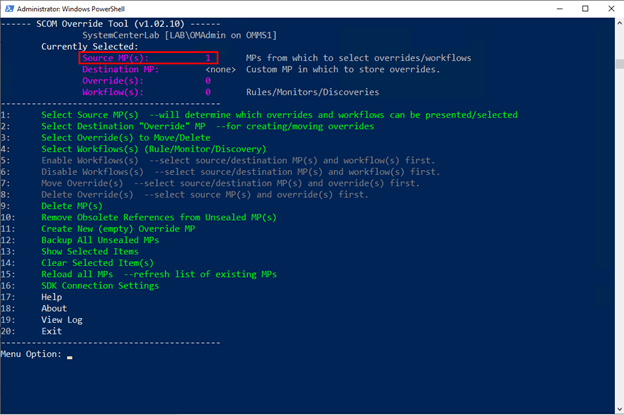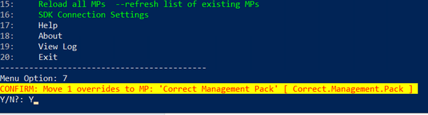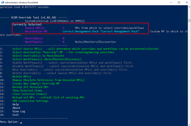The overrides will take a few minutes to move to the new Management Pack. When completed the menu will return. Click exit.