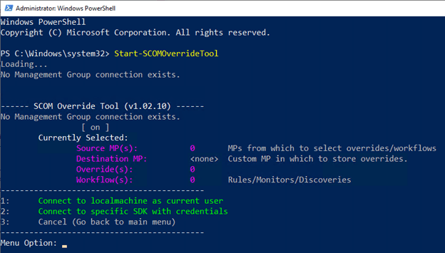 Start the tool executing the Start-SCOMOverrideTool. The tool will begin to run.