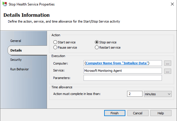 Stop Health Service – The service will need to be stopped before the folder can be renamed. Under the Security tab, I am using credentials that have the rights necessary to perform the actions against the service.