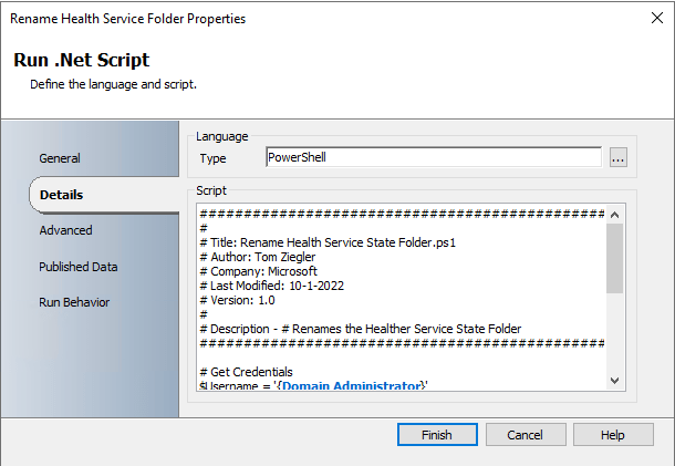 Rename Health Service Folder – A simple script will run to change the name of the folder. Grab my script here. The script uses variables I have stored in Orchestrator to rename the folder. Change out the SERVERNANE place holders with the Variable for the Computer Name. Also in the script change out the $Username and $Password with the variables of the account that is used for the connection. As a recommended practice the password variable should be encrypted.